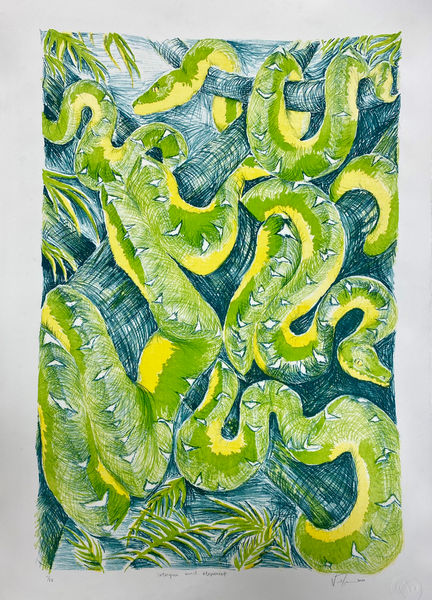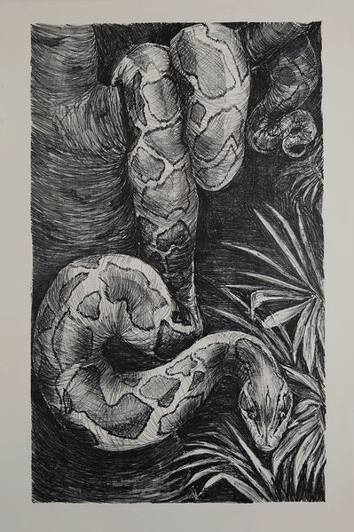 Ultimately, these pieces draw on the self as a confrontation of anxieties and encouragement to rise to the occasion. For me, creating these intense subjects is a way of instilling inner confidence and personal growth. The unpredictable nature of the snake mirrors the unpredictability of life. And as the world around us continues to form conflict, our best way of finding resolution is to ground from within. To coil and keep ourselves protected, strike when we need, but never to cower in the face of our inevitability.